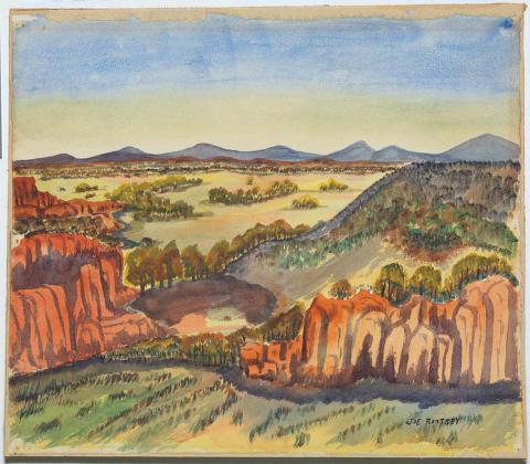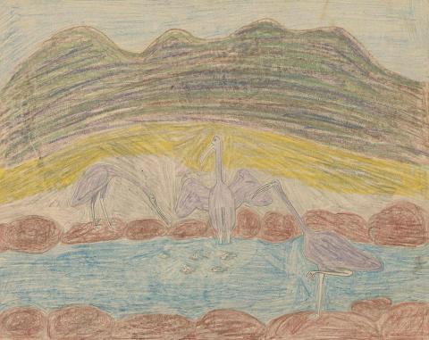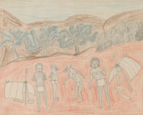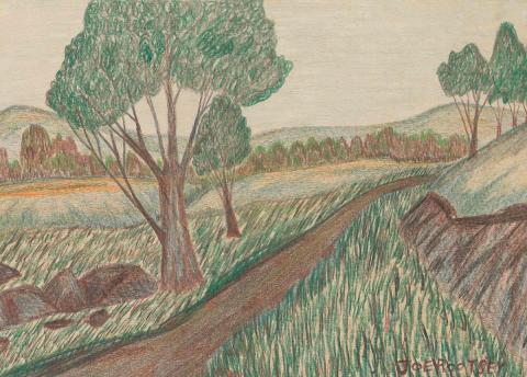 Joe Alamanhthin Rootsey spent his early years working on numerous cattle stations before marrying and finally settling on ‘Olivevale’, near Laura, west of Cooktown. In 1954, he was diagnosed with tuberculosis and spent two years at the Cairns Base Hospital. It was during this time that he began sketching, inspired by memories of his country around Cooktown and Barrow Point. After Rootsey’s works were exhibited at the Cairns Show, his talent was brought to the attention of the Department of Native Affairs. In 1958, he was invited by the department to attend the Central Technical College in Brisbane to undertake art training. Rootsey once again became ill with tuberculosis and died at Cooktown Hospital on 27 June 1963, aged 45.