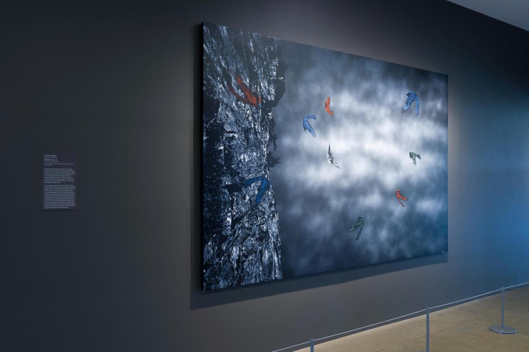 In sourcing the images of birds from around the world and the cliffs from the iconic Grand Canyon in the United States, Cotton has created a painting in which he attempts to come to terms with his own sense of being adrift. These dislocated feelings, the artist believes, come from the loss of aspects of his cultural heritage as a Māori man in Aotearoa. In distorting, accentuating and overlaying this appropriated content with paint, the landscape is now a nameless place — the question becomes not ‘where is it?’ but ‘when is it?’ Having named the painting after a term used by astronomers to describe the colour of stars and galaxies as they move away from earth, the artist presents us with a sense of deep time, inviting us to become active travellers in Red Shift’s metamorphic space.