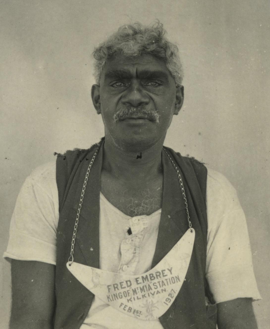 Bestowing Aboriginal men with breastplates was a practice instigated by early European settlers to give status to ‘cooperative’ individuals, regardless of their status within their own community. Aboriginal society never had ‘kings’; this convention was imposed upon Aboriginal people by settlers. Fred Embrey was given this breastplate in recognition of his strong traditional connections to the Country in the region of Mt Mia Station near Kilkivan, yet the Country that Embrey was associated with was much broader than this.