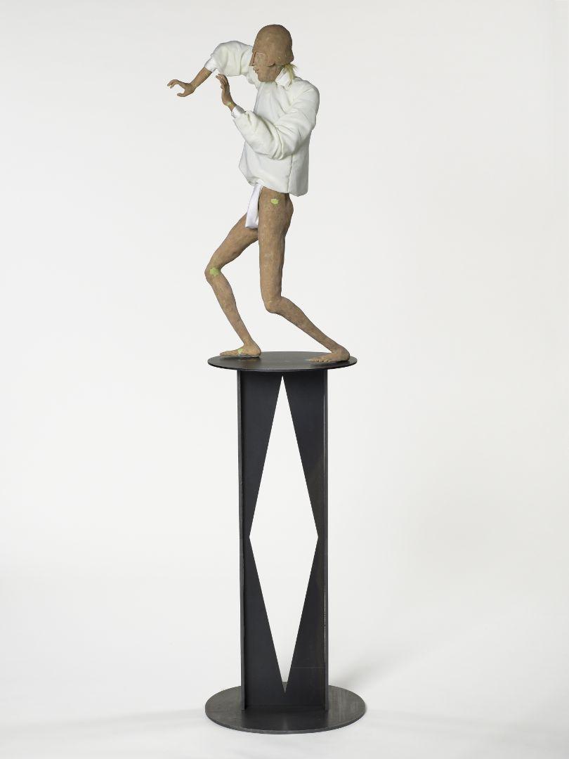 Francis Upritchard's five spectacular figurative sculptural works shown in APT8 reference a variety of cultural and temporal influences that capture the movements of a theatrical war dance. Upritchard draws on street performance traditions dating from the time of court actors and jester troupes, as well as Renaissance sculpture and a group of combatants in the Bayeux tapestry. The figures deliberately tread a line between reality and fantasy: less than life-size, captured in elaborate poses with ungainly limbs and half-closed eyes, and standing on carefully designed plinths, they resemble marionettes absorbed in their own world. Upritchard's aesthetic is one of the handmade, reclaimed and recycled. Her figures, made from polymer modelling clay pressed over wire armatures, wear billowing white shirts and grey knitted chain mail. Enigmatic and detached, they act in an undisclosed play or masquerade.