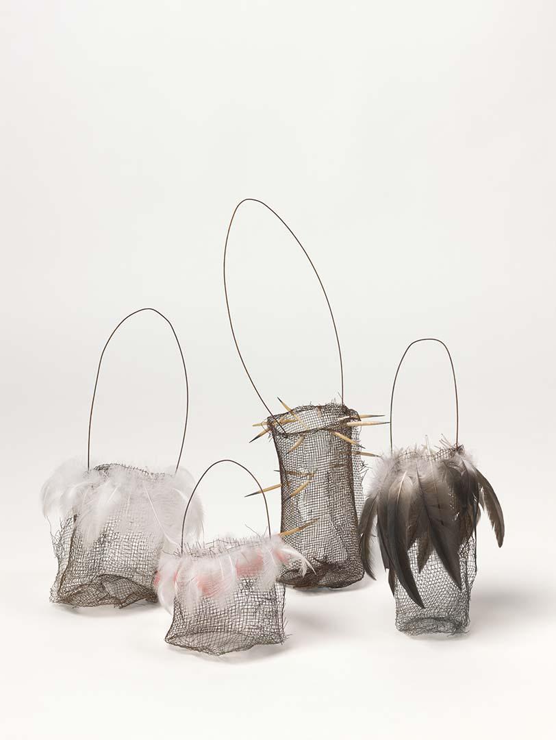 Lorraine Connelly-Northey / Waradgerie people / Australia b.1962 / Narrbong (String bag) 2007 (rusted gauze wire with white pelican down); Narrbong (String bag) 2007 (rusted gauze wire with galah feathers and pelican down); Narrbong (String bag) 2007 (rusted gauze wire with echidna quills); Narrbong (String bag) 2007 (rusted gauze wire with black pelican down) / Dimensions vary / Purchased 2008. The Queensland Government’s Gallery of Modern Art Acquisitions Fund / Collection: QAGOMA: Photograph: Natasha Harth