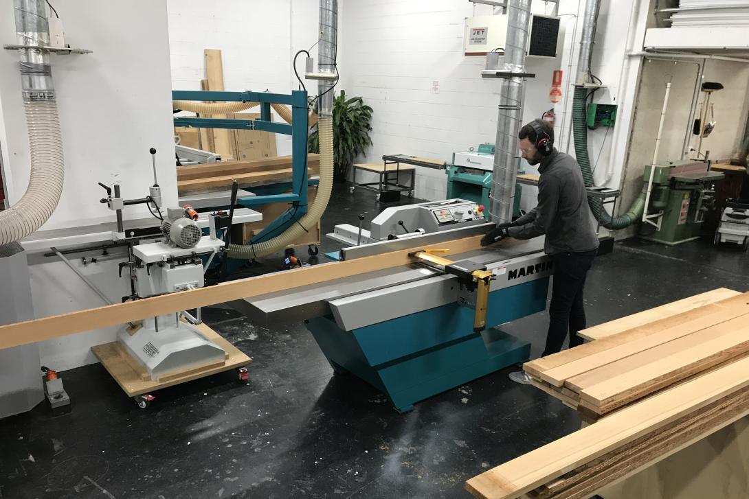 Equipped with the machinery and expertise to manufacture the exacting products required, the CFFS’s first task is to select suitable lengths of rough-sawn timber boards. The boards are cut down to size using a panel saw, then the four sides of the timber are planed to the correct dimension in a process called jointing and thicknessing. The final step is undertaken with a Marunaka fixed-knife finish planer — a machine that works by pulling the timber past a stationary planer blade, taking an ultra-fine shaving from the face of the timber and eliminating the need for sanding.