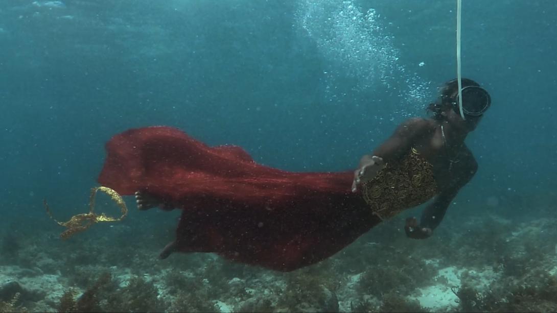 Martha Atienza’s Our Islands 11°16’58.4”N 123°45’07.0”E 2017 recreates the annual Ati-Atihan festival in the village of Madridejos on Bantayan Island in the Philippines. The parade honours the infant Jesus (Santo Niño), whose likeness is blessed by the local priest and carried through the town. Atienza’s film depicts a dreamlike procession beneath the sea, with the participants pushing against the water as if in a trance. Heading the procession is a man dressed as Santo Niño; he is followed by Christ carrying a bamboo cross; an overseas foreign worker (known as an OFW); an international seafarer; a survivor of 2013’s super typhoon Yolanda; and a drug lord, menaced by President Duterte’s anti-drug squad pointing guns at his head. All the costumes represent responses to current events and issues.