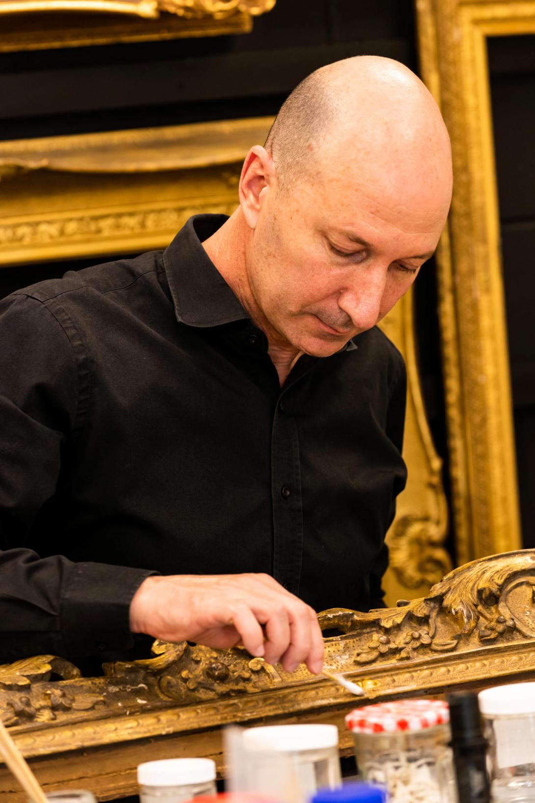 RZ: Yes, you need to finish the previous step to go on to the next. Once all the gesso losses have have been filled and the carving and gilding completed, the final step is toning the bright gold to match it back in to the colour of the existing gold. Then there’s putting the painting in — in this case, with a new backing board. But for conservation work on the frame, the final-final step is toning and patination of the gold leaf. You don’t want to have really bright areas of gold next to gold that’s 150 years old.
