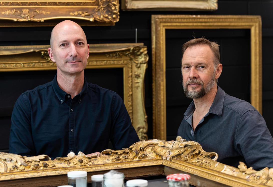 Robert and Damian work on the Romney frame in the QAG Framing Studio, October 2022 / Photograph: C Callistemon, QAGOMA