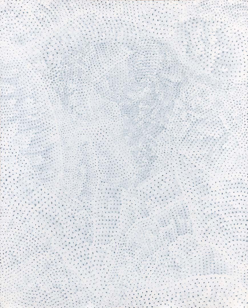 Yayoi Kusama first began to paint 'Infinity nets' after watching waves ripple below her while on a flight from Japan to the United States. Infinity nets evokes many fluid forms: foam on a wave, soap bubbles, or the ebb and flow of a rier. The painting comprises tiny crescent shapes repeated in ever-expanding arches. Kusama's gestures build up into a network of interlocking forms; at some points the paint is thick and sculptural, while at others it is fine and translucent. Like cells nested together, competing for space, the circles appear to vibrate and undulate across the canvas.