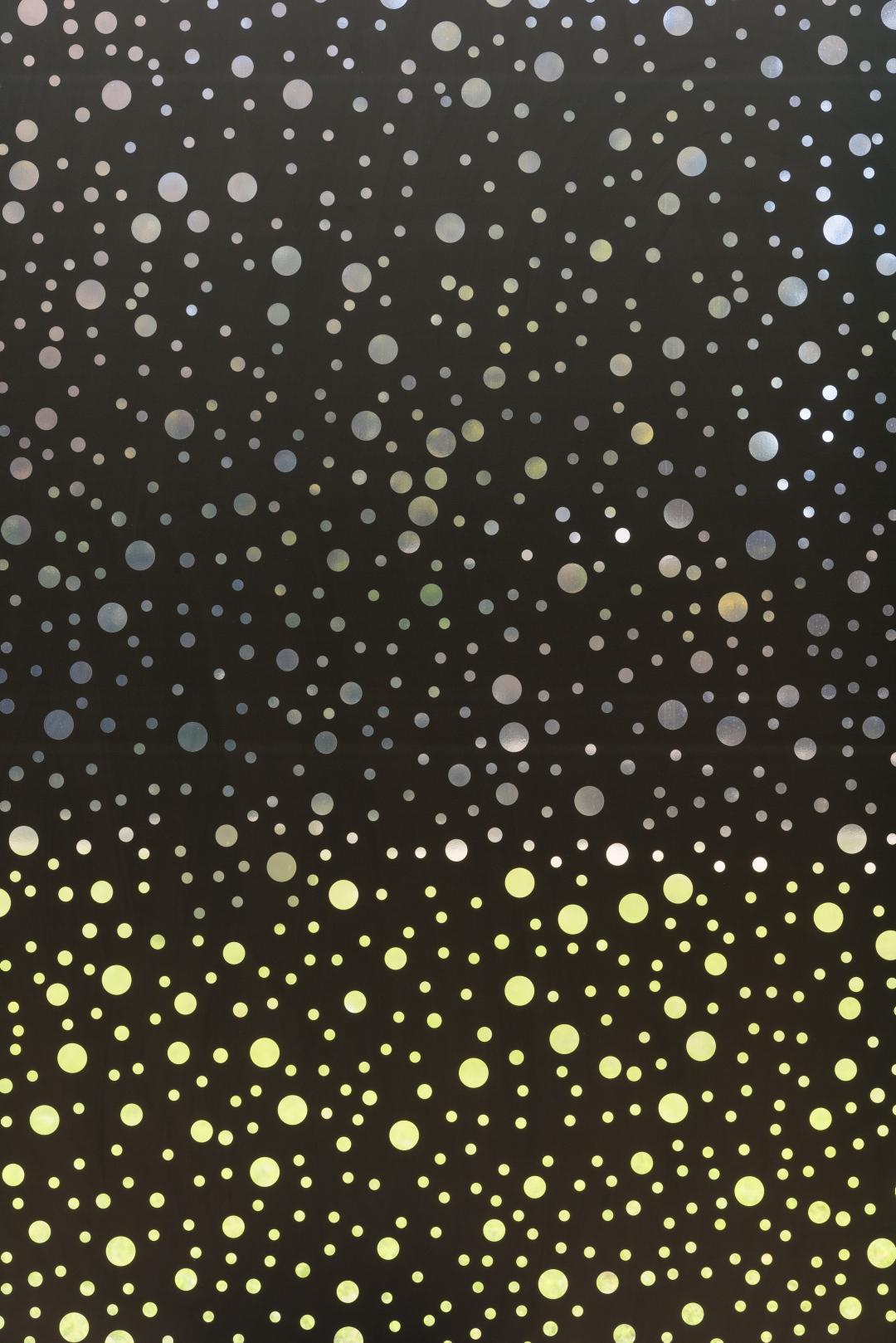 Other exhibited works are also informed by scientific ideas draw on histories of Op [optical] art and minimalism. Taree Mackenzie’s Pepper’s ghost, wind turners, blue and yellow 2018 and Jonny Niesche’s ‘Schein blossom’ series of interference-pattern prints play on perception — how light, colour and movement influence what your eye sees. Meanwhile, the reduced palettes of Teelah George, Carbiene McDonald Tjangala and Gemma Smith’s restrained palettes reward close looking; their subtle shifts in colour draw the viewer’s eye around each composition. At first, Smith’s Rotate 2019 might look like a blank canvas, but it becomes charged and dynamic over time.