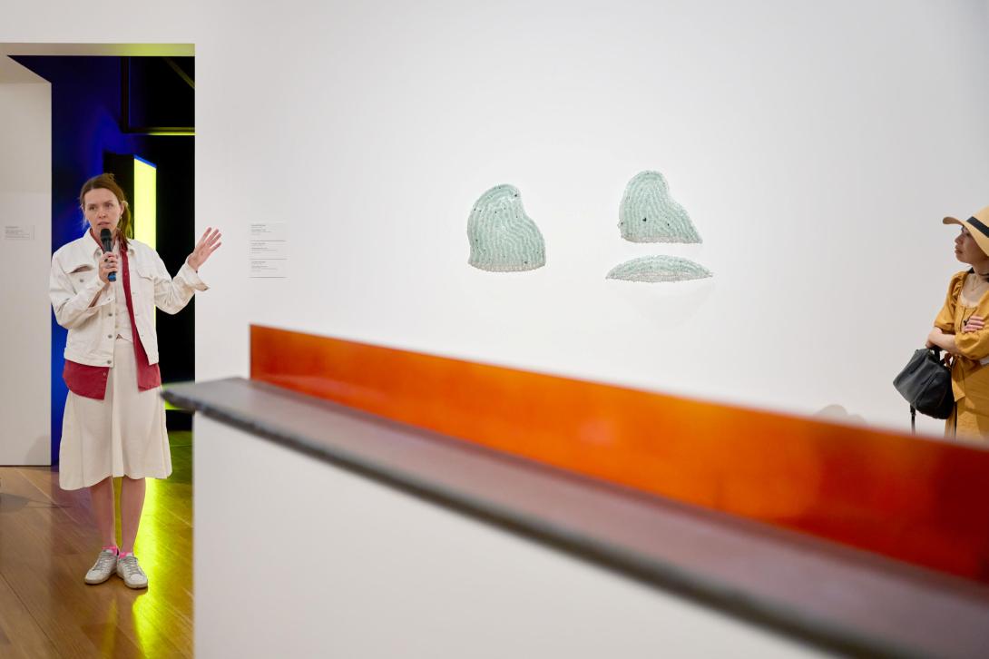 Lauren Burrow introduces works from ‘Slow Plosion’ 2022 on a ‘Living Patterns’ tour, with d harding’s Moonda and The Shame Fella 2018 visible in the foreground, QAG, September 2023 / © The artists / Photograph: C Sanders, QAGOMA
