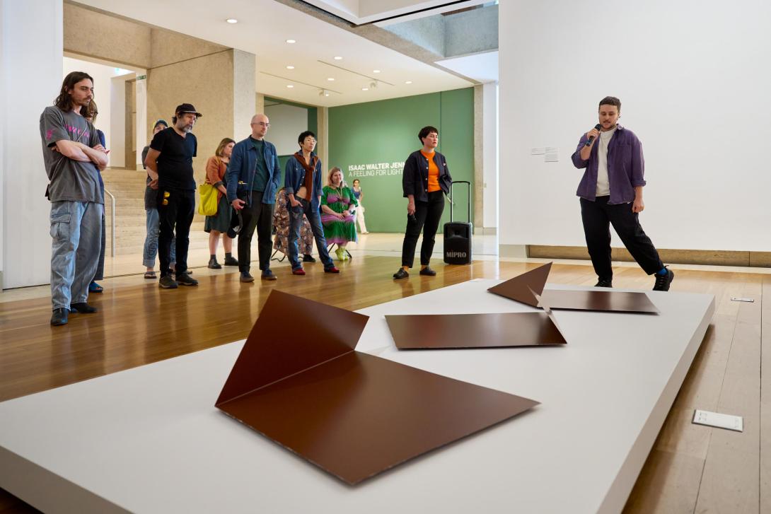Spence Messih introduces their steel work You move (on the other side of) 2017 on a ‘Living Patterns’ tour, QAG, September 2023 / Courtesy: The artist and Alaska Project / © Spence Messih / Photograph: C Sanders, QAGOMA