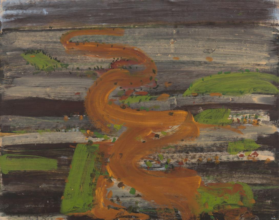 This new process freed him up; his paintings were less restrained, and he could apply precise colour selections in thin layers, accenting them with sensuous line work. This approach enabled him to capture, in this painting, a series of rapid impressions of the turbulent, flooded Balonne River in south-west Queensland.