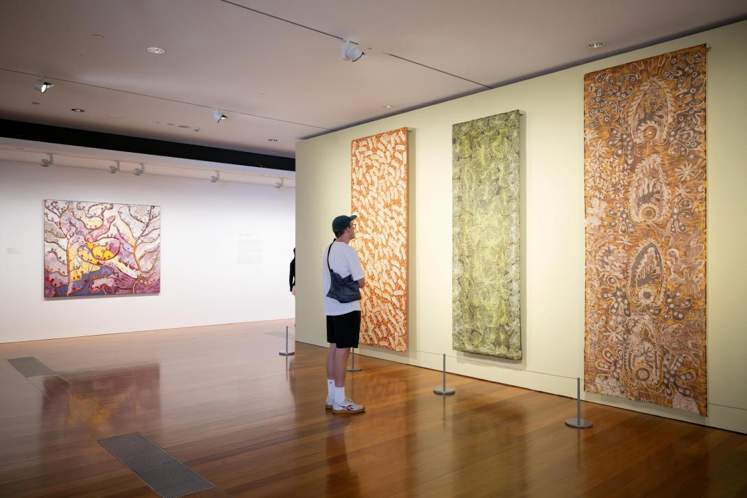 A view of ‘Seeds and Sovereignty’, featuring (l–r) Nellie Ngampa Coulthard’sTjuntala Ngurangka (Country with Acacia Wattle) 2018; Glory Ngal’s Textile length: Tharrkarri (Honey grevillea) 1996 / © Glory Ngal; Emily Kame Kngwarreye’s Textile length c.1989; and Nura Rupert's Textile length c.1982, GOMA, March 2024 / © The artists/Copyright Agency (unless noted) / Photograph: C Callistemon, QAGOMA