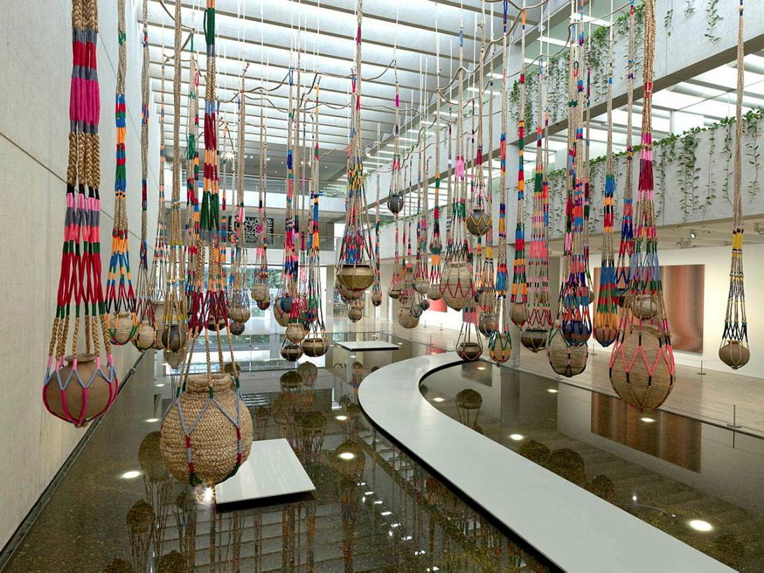 Constructed with 70 giant shikas — embroidered, reticulated bags typically made of jute strings that are tied to an exposed beam — The fibrous souls explores part of Bengal’s colonial history, inspired by the families that followed the railway tracks after the British East India Company established the Eastern Bengal Railway and later displaced in Bangladesh. Working with 13 women from jute-making families to construct the shikas, along with a handful of local craftspeople to create the pots and connecting jute ropes, Kamruzzaman and Gidree Bawlee have constructed a giant hanging system of shikas, laid out as a map of the historic railway.