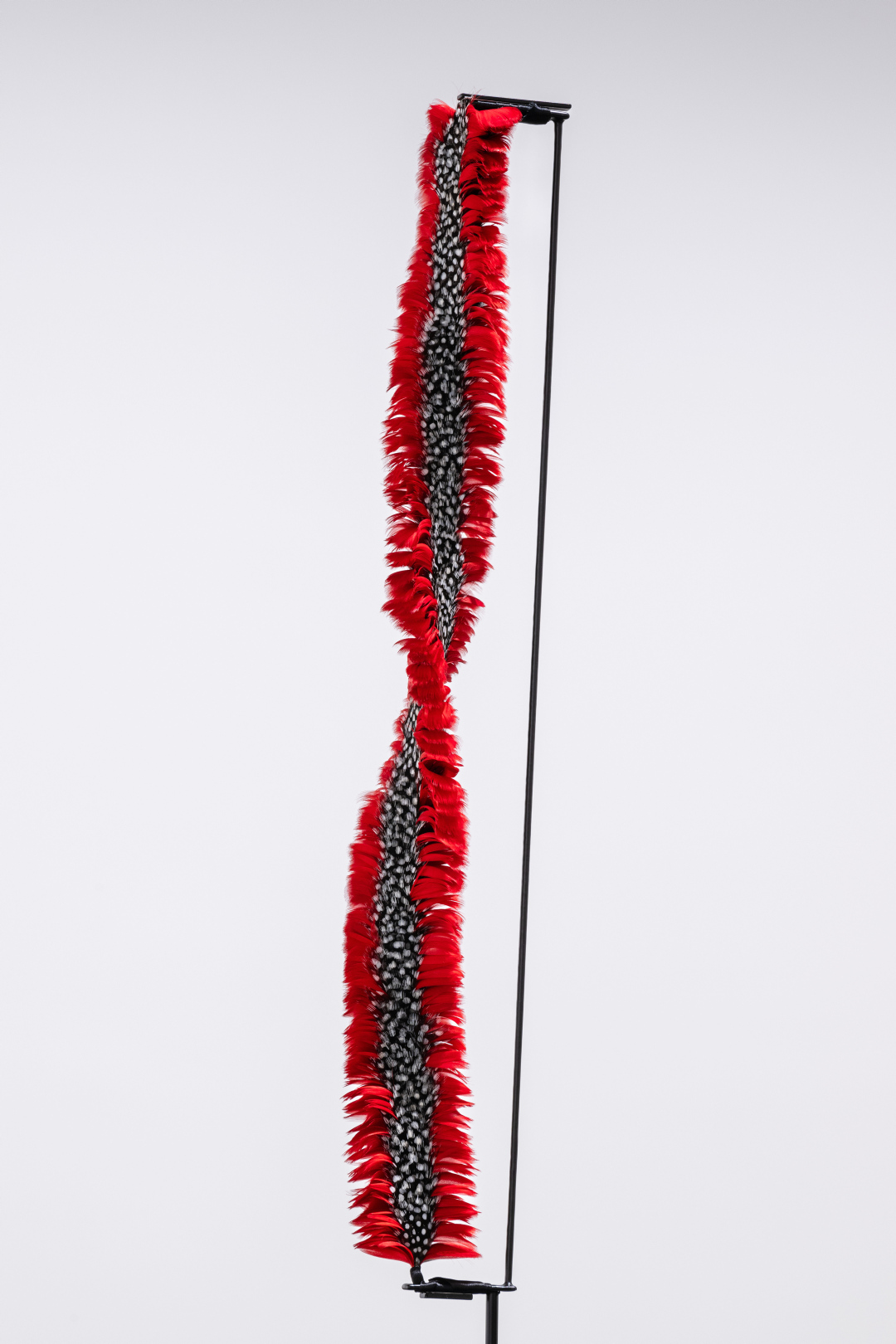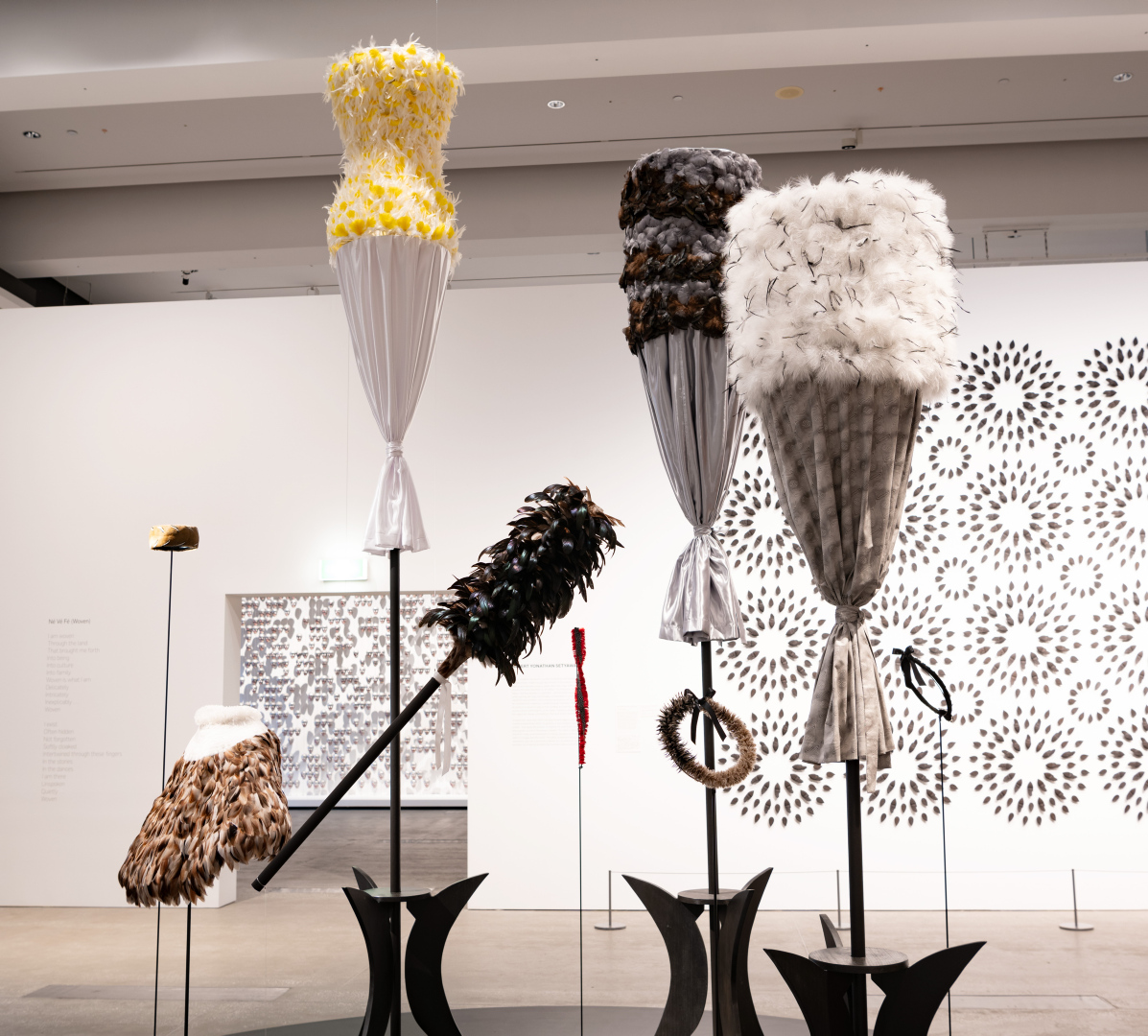 Hina 2024 is an installation that brings the three distinctive featherwork forms — lei, kāhili and ‘ahu‘ula — together in a single unified arrangement. The work honours the stories and attributes of Hina, Goddess of the moon, one of the oldest Hawaiian deities. The balance between feminine and masculine energies is celebrated in Hina’s stories, with the moon understood as an ever-present creative force and guide to living in alignment with natural rhythms. In both form and materiality, Chun’s work symbolises the spiritual and practical roles that featherwork plays in the lives of Hawaiian people, and the significant contributions women have made to caring for the practice.