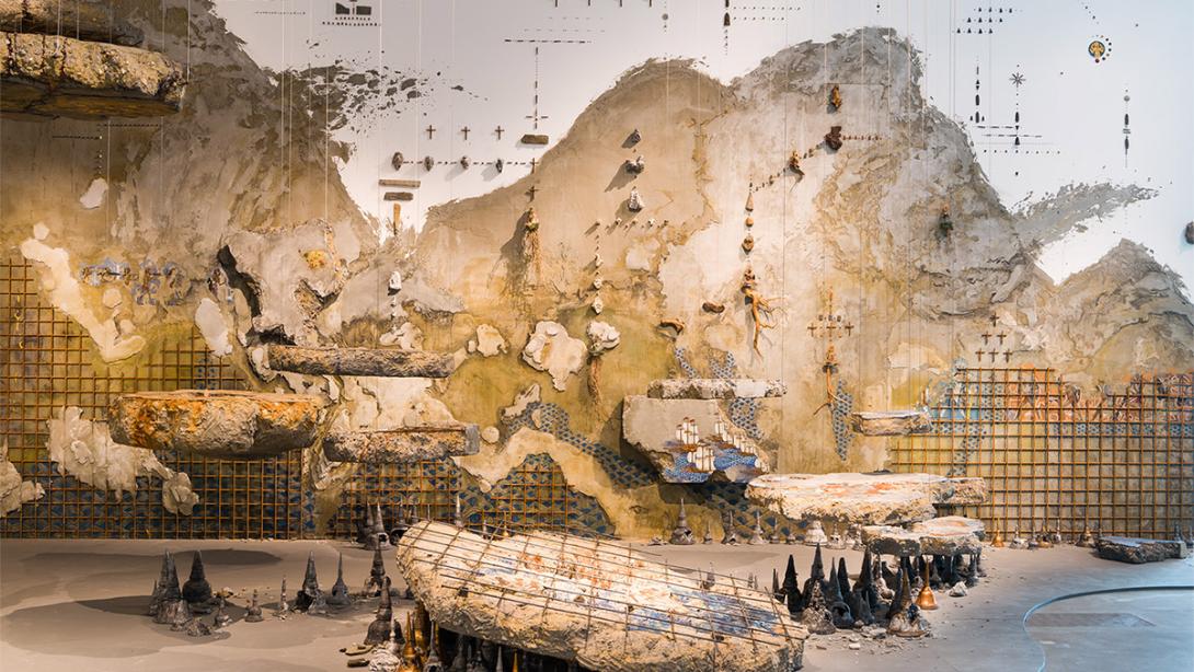 Pannaphan Yodmanee was trained in traditional Buddhist painting from a young age. She now draws on Buddhist cosmology to create site-specific installations that resemble modern ruins or demolition sites. She constructs these using slabs of demolished concrete, exposed iron structures and walls primed with concrete and rocks. These raw elements are delicately painted with scenes depicting historical events in South-East Asia, including conquests, battles and journeys across land and sea. She uses gold leaf and the vivid blues associated with Thai Buddhist art, and also creates her own Buddhist objects and icons, which are dispersed throughout the installation like secrets waiting to be discovered. Yodmanee is particularly interested in the role that faith and religion have in our lives, and their capacity to foster peace and happiness, but also destruction, conflict and violence.
