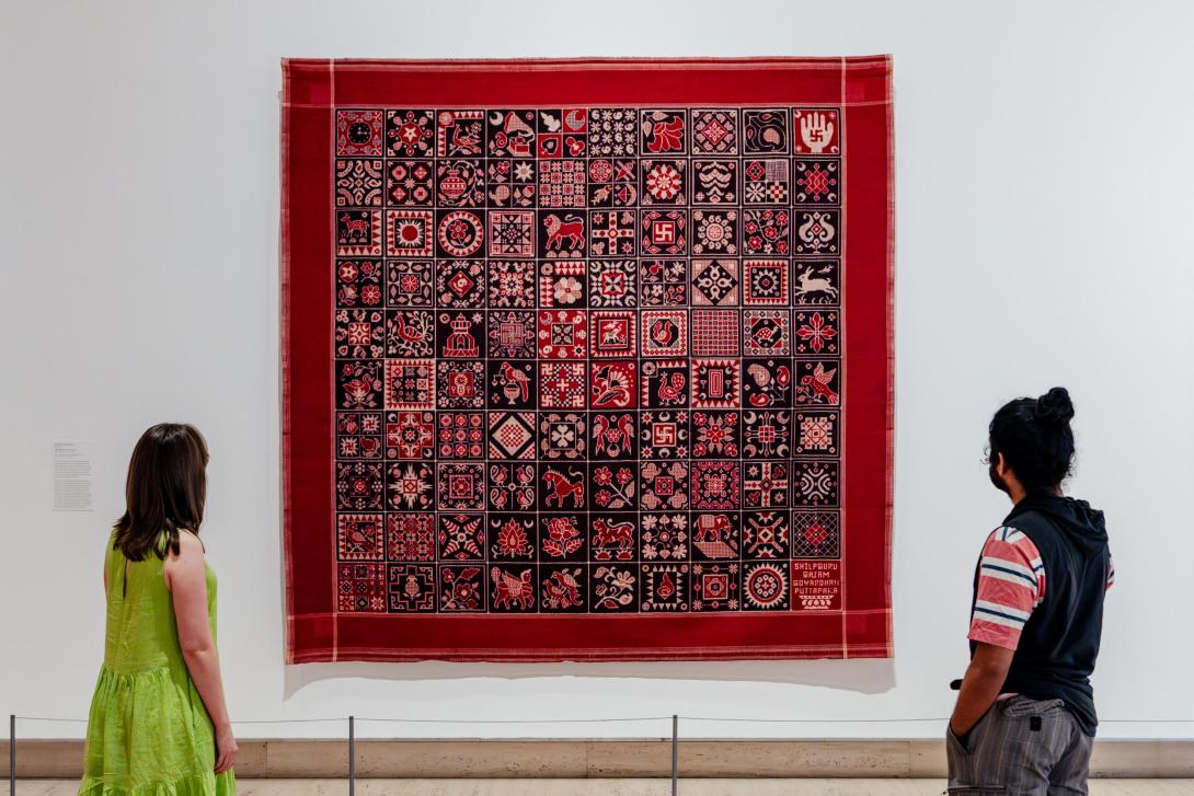 Gajam Govardhan’s award-winning 100 motif telia rumal 2011, installed for the first rotation of ‘I Can Spin Skies’, QAG, November 2023 / Gift of Dana McCown through the Queensland Art Gallery | Gallery of Modern Art Foundation 2020 / © QAGOMA / Photograph: J Ruckli, QAGOMA